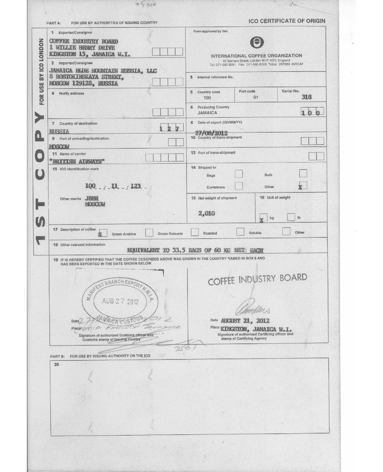 Подлинность и качество нашего кофе «Блю Маунтин«(Ямайка) подтверждены соответствующими сертификатами